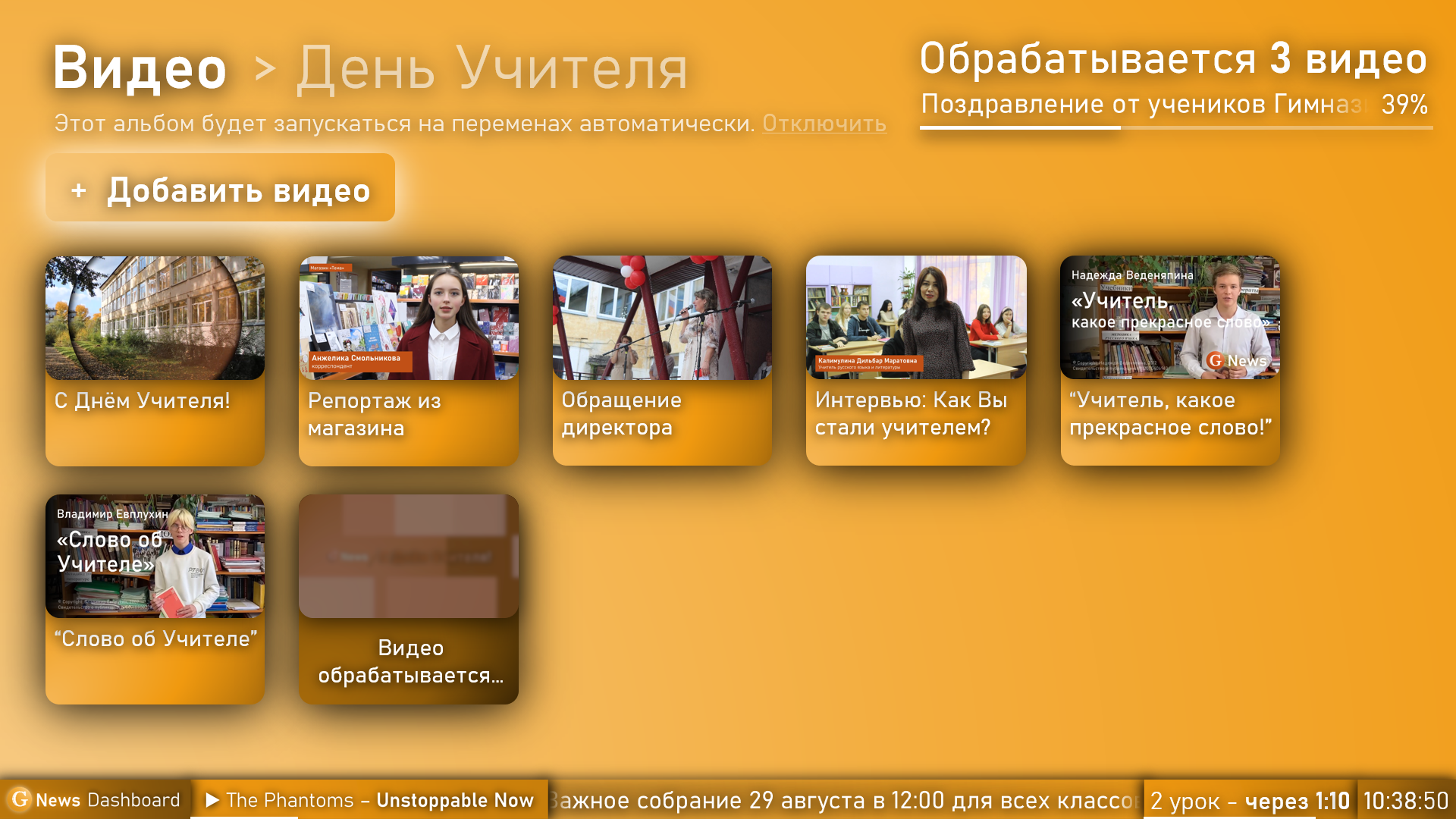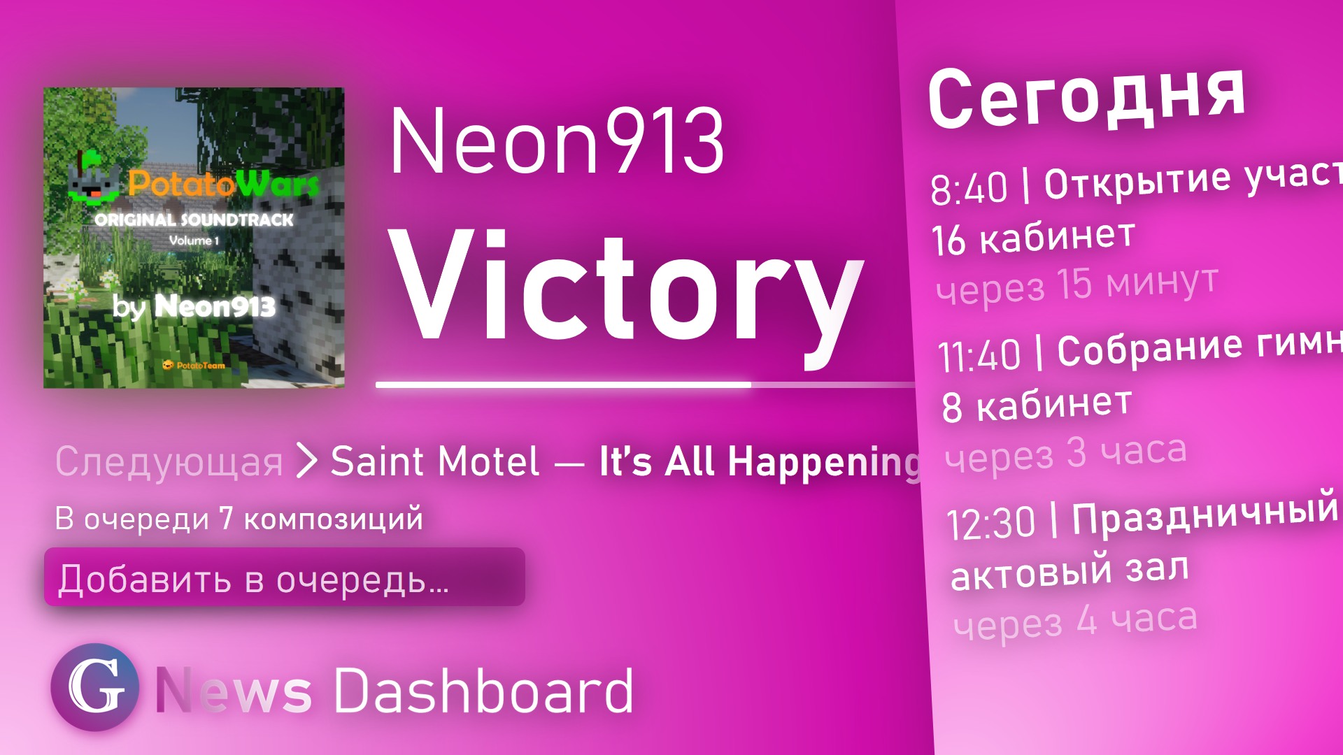GNews Dashboard v1.3 (5 апреля 2022) Расписание становится динамическим! • Представляем Расписание! Составляйте расписание уроков на каждый день, которое синхронизируется со звонками и динамически обновляется. Расписание можно экспортировать как PNG и распечатать или отображать на отдельном дисплее. • Расписание звонков можно закрепить как постоянное, чтобы после окончания сокращённых уроков вернуться к нему в один клик! • Теперь автоматический режим включается по умолчанию. Отключить его можно только нажатием Ctrl+A. • Теперь имена именинников могут быть в два раза длиннее, а также могут содержать пробелы. • Изменён дизайн списка объявлений, и теперь в нём отображаются все объявления, а не только первые 8. • PIN-код теперь хранится более безопасно и шифруется. Перед обновлением снимите защиту PIN-кодом или переустановите Dashboard. • Кнопки управления Музыкой теперь всегда закреплены сверху на экране «Музыка». • На экране «Музыка» теперь работают кнопки Home, End, Page Up и Page Down, а также исправлены визуальные ошибки при резкой прокрутке. • Dashboard теперь будет предпринимать попытки конвертации аудиофайлов с неподдерживаемыми кодеками, чтобы их можно было воспроизвести. При неудачной попытке такие файлы будут удаляться из плейлиста, предотвращая сбои. • Изменено то, как происходит активация Dashboard. Вам потребуется новый код активации в зависимости от того, для чего будет использоваться дисплей. • Исправлен эффект нажатия на кнопки Главного экрана, а также улучшена анимация наведения. • Улучшена анимация текущей мелодии на экране «Музыка». • Буква «у» больше не торчит из кнопки «Добавить музыку». • Улучшена производительность на экранах с прокруткой. • Исправлено, что в Настройках некоторая информация снизу могла не влезать. • Исправлено, что кнопка «Закрыть» в разделе «Музыка» не нажималась в Траурном режиме. • Исправлено переполнение очереди музыки. • Dashboard больше не должен критически отключаться во время загрузки музыки из-за ошибки анимации. • Все параметры теперь также синхронизируются в фоновом режиме. • Исправлено, что отмена Дней Рождения сбрасывалась через несколько минут.