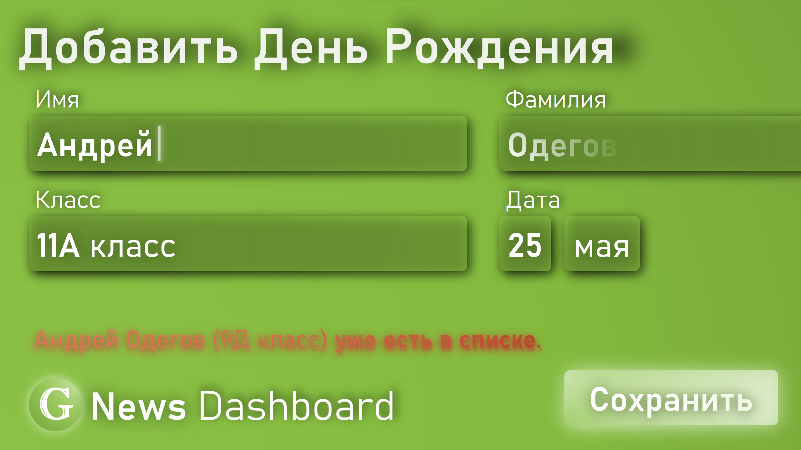 GNews Dashboard Beta 1.0.2 (23 декабря 2020) Лишний интервал... • В некоторых случаях поле "Класс" в режиме "Дни Рождения" сильно смещалось вниз, даже когда этого не нужно было. Этот баг исправлен!