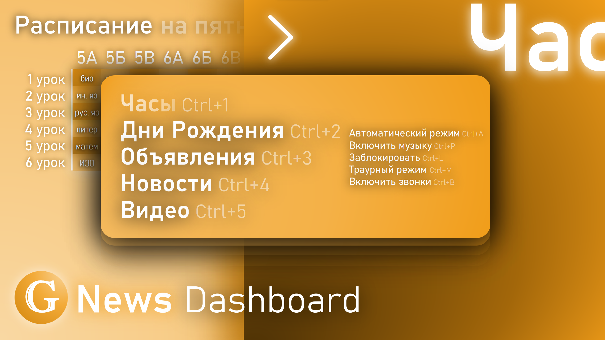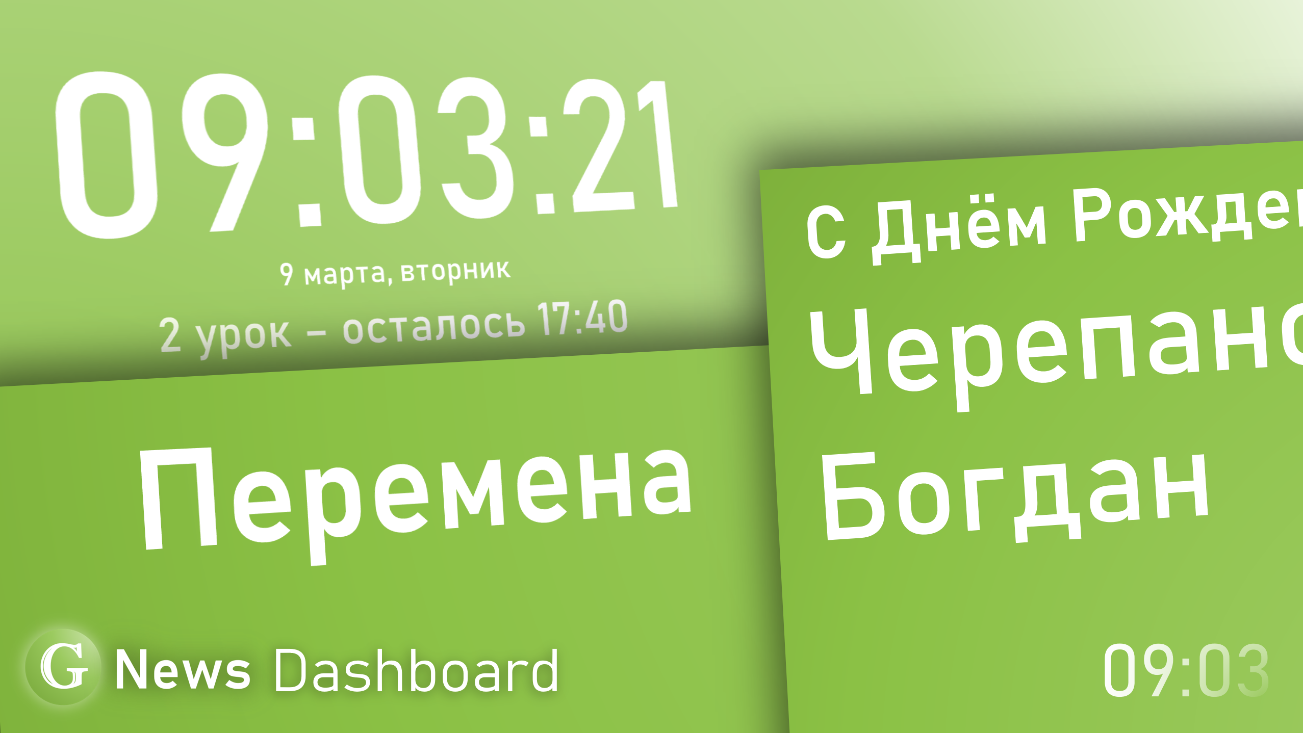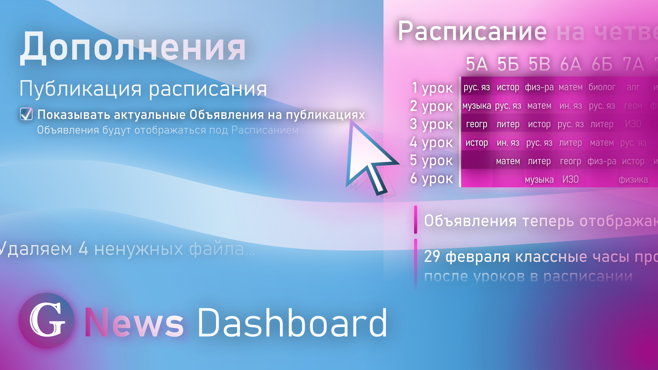 GNews Dashboard v2.2 (12 марта 2026) Ваша школа становится умнее! • Совершенно новое Расписание! Ведите учёт не только кабинетов, но и преподавателей! Процесс составления Расписания остаётся таким же простым, как раньше, но теперь двойным щелчком по клетке в таблице Расписания или нажатием Ctrl+Enter можно указать учителя. • Дисплей Расписания теперь поддерживает вертикальные экраны! На таких дисплеях отображается Расписание уроков на всю неделю. • Названия предметов в Расписании теперь автоматически сокращаются, если не хватает места, и разворачиваются, если таблица достаточно широкая! Полное название предмета, а также преподавателя можно увидеть, коснувшись по клетке Дисплея Расписания. • Новая панель на Дисплее Расписания позволяет переключаться между разными режимами отображения — на день для всех классов или на всю неделю для конкретного класса, преподавателя или кабинета! Внешний вид меню редактора Расписания также обновился. • Улучшена палитра таблицы Дисплея Расписания! Фоновые цвета стали сочнее, а таблица остаётся контрастной при любом используемом цвете! • На экране «Параметры» появились настройки Расписания! Выбирайте, нужно ли показывать сдвойки или отображать названия уроков. • Из Расписания класса, преподавателя и кабинета теперь можно одним кликом переходить в Расписание для всех классов на конкретный день, просто щелкнув по названию дня недели во время редактирования! • Исправлено, что название класса могло сброситься при щелчке на другой класс до применения названия выделенного класса. • При редактировании Расписания для класса теперь отображается предупреждение, если у выделенной ячейки есть сдвойка с другим классом. • Исправлено, что Расписание для класса могло закрепиться как постоянное, когда его об этом никто не просил. • Добавлены новые и изменены раннее существующие анимации переходов между разными экранами Редактора Расписания, пока на фоне идёт загрузка. Анимации сразу заканчиваются, как только Расписание становится готовым к редактированию. • Кнопка «Сохранить и отправить» в редакторе Расписания теперь называется «Распечатать или отправить». Так понятнее. • Время звонков на Дисплее Расписания теперь показывается для всех отображаемых дней, а не только на сегодня! • Исправлено, что при активном фоновом изображении на Дисплее Расписания был виден прямоугольник поверх названий звонков во время перехода на отображение времени и обратно. • Исправлено, что Расписание для класса могло уехать наверх, и его невозможно было обратно достать прокруткой колёсика мыши. • Новости обновились! Встречайте улучшенные шаблоны. • Новости при показе на Автоматическом дисплее теперь обновляются каждые 20 секунд. На экране отображается сообщение, если что-то изменилось прямо сейчас! • Значительно ускорена загрузка, сохранение и обновление всех данных Dashboard. • Значительно оптимизирована загрузка изображений Новостей. • Пока загружаются картинки Новостей, текст публикации теперь всё равно виден — и отображается по центру экрана. • Добавлены анимации при редактировании и сохранении Новостей. • Исправлено, что курсор мыши мог постоянно иметь вид руки на экране редактирования Новости. • Предлагать свои Объявления теперь можно и на сенсорных экранах! На Автоматических дисплеях теперь будет отображаться 
