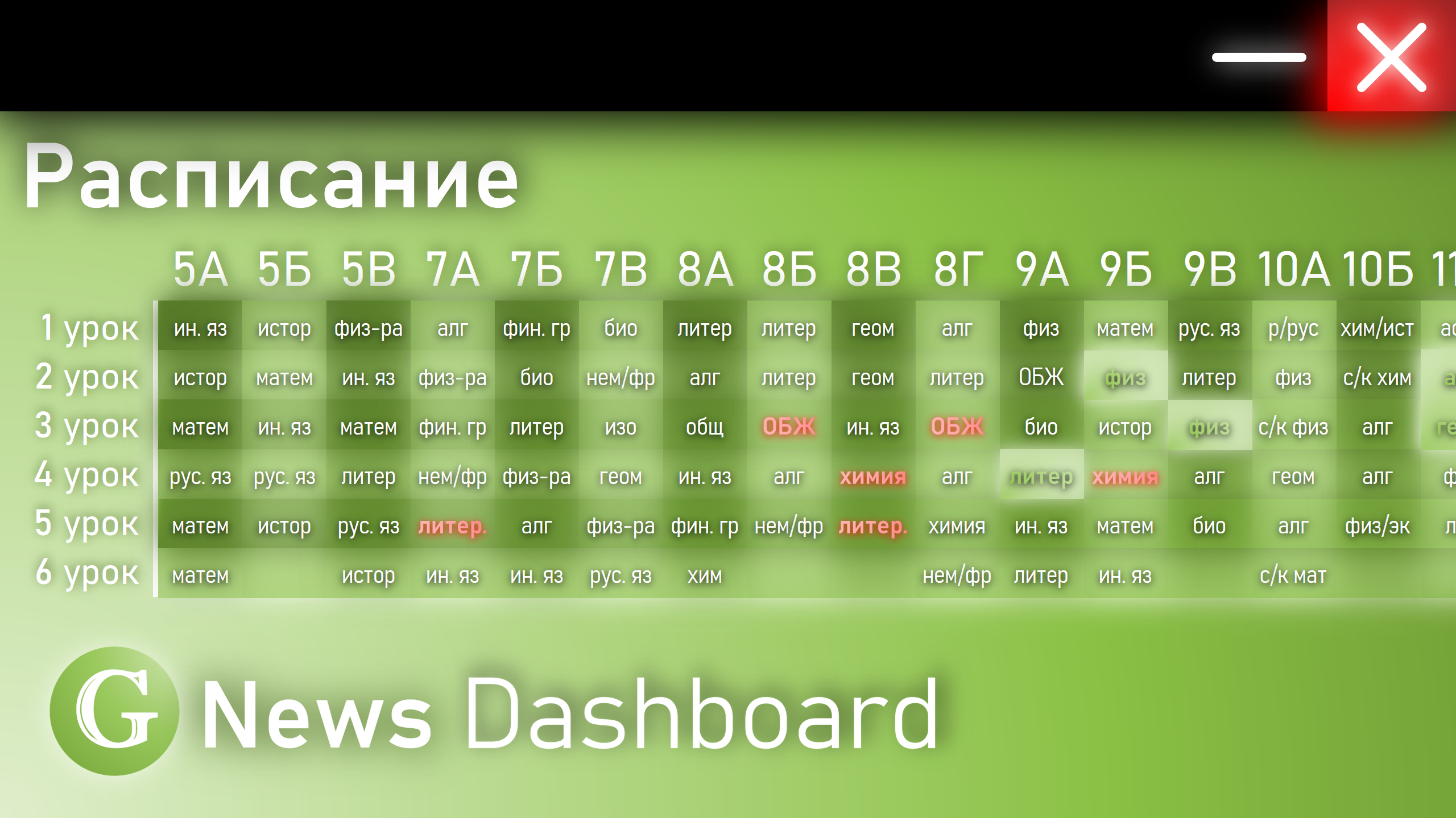 GNews Dashboard v1.3.2 (9 апреля 2022) Делаем расписание удобнее • Добавлена верхняя панель с кнопками «Закрыть» и «Свернуть» в версии для управления расписанием. Панель отображается при наведении мыши к верхнему краю экрана. • В Редакторе расписания теперь выделяются красным обнаруженные сдвойки. Этого не видно на версии для показа или при экспорте расписания. • Исправлены некоторые проблемы с активацией Dashboard. • Оптимизирована синхронизация расписания. • Нажатие Ctrl+4 теперь перейдёт к показу новостей, если они существуют.