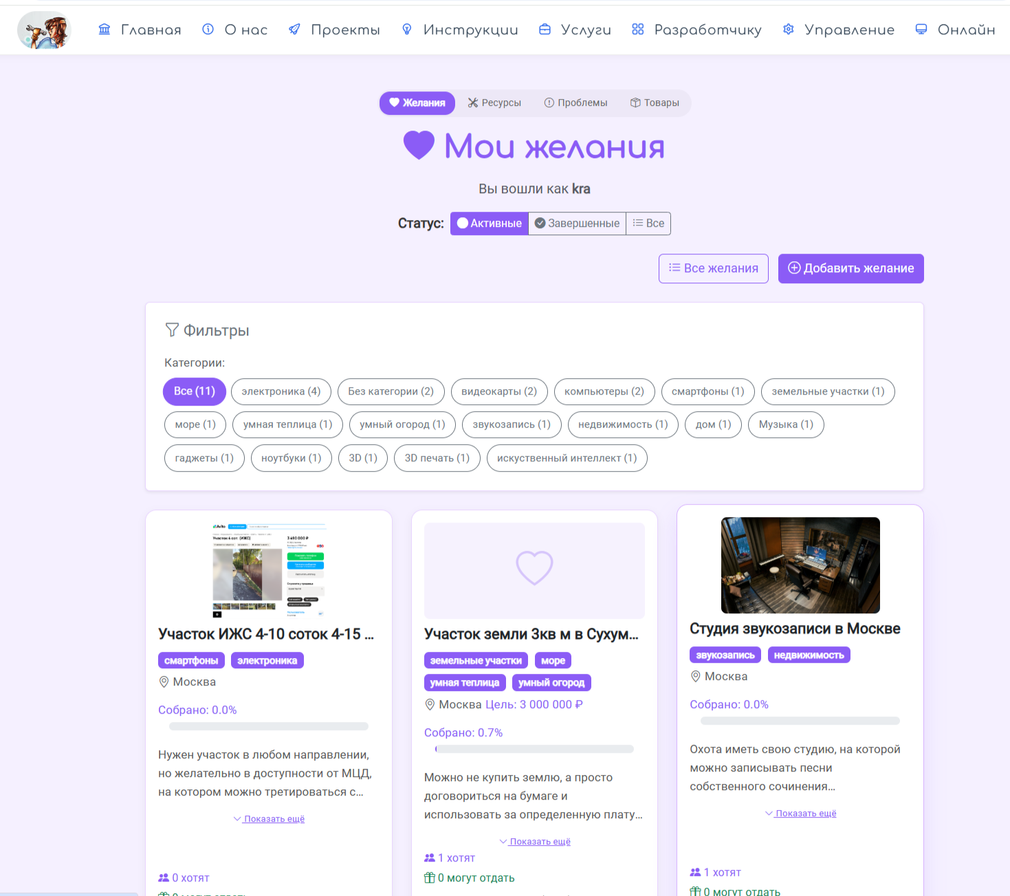 Реализованы желания в сообществе. Теперь каждый участник может делиться материальными запросами: чего он хочет от жизни. Реализованные желания становятся ресурсами, которые можно продать. Например, если Вы захотели телевизор, но спустя полгода переехали, а в новой квартире этот второй ТВ вам ну вообще не нужен, то он не уходит из сообщества как в случае с Авито-продажей. а может достаться другому участнику, как опция - даже с правом совместного использования.