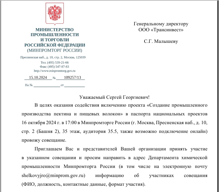 21 декабря 2023 года Комитет Совета Федерации по экономической политике опубликовал Рекомендации "круглого стола" в которых, упоминая наш проект, рекомендовал Министерству промышленности и торговли Российской Федерации рассмотреть информацию, предоставленную ООО "Трансинвест" по проекту "Создание промышленного производства пектина и пищевых волокон".