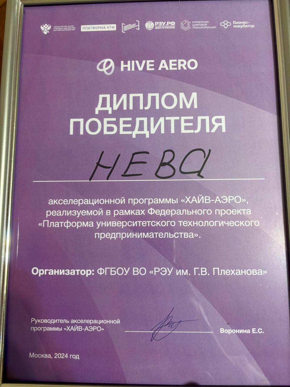 Победитель акселерационной программы HIVE AERO 2024, заняв 1 место из 86;
