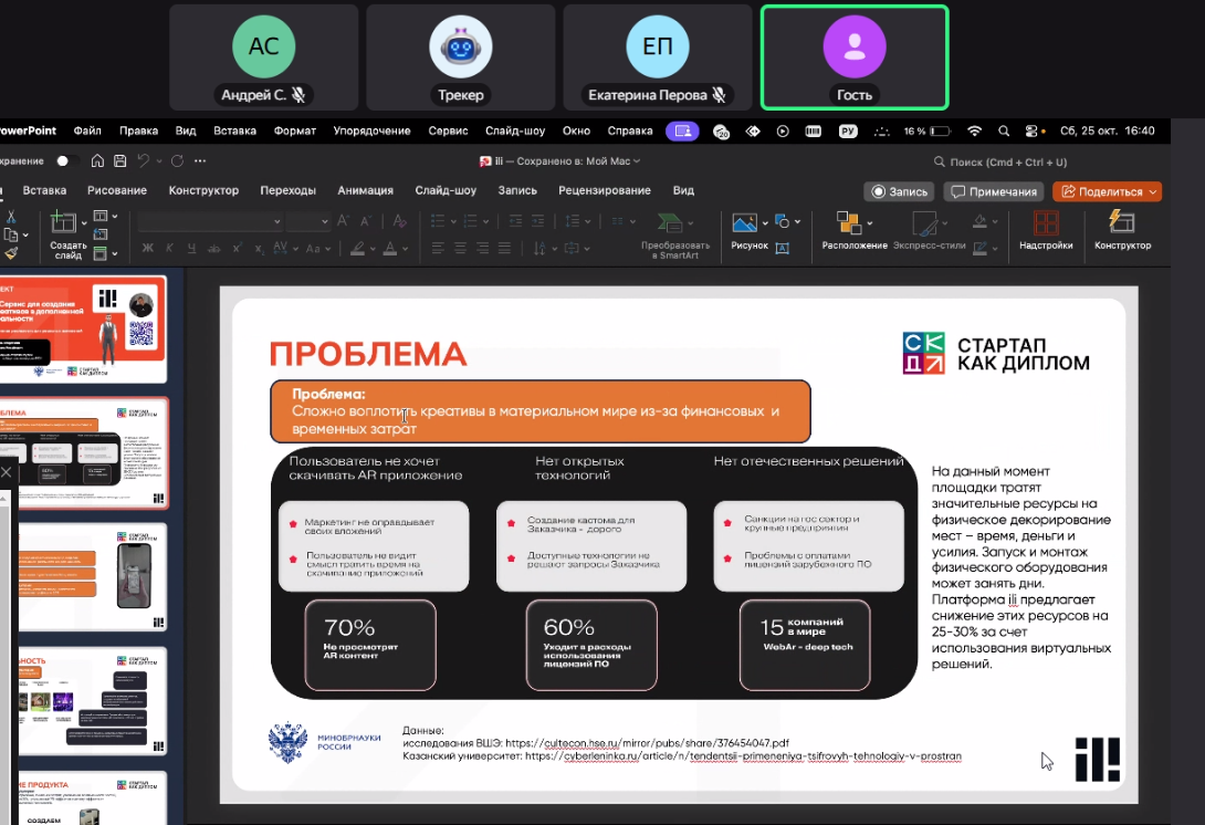 Провели встречу в онлайн-формате с руководителем трекеров акселератора, который неоднократно защищал проекты на различных конкурсах, в том числе ТОП 50 стартап проектов НТИ! Задали интересующие нас вопросы, получили ряд ответов. Многие моменты к сожалению, он осветить не смог, но обещал связаться с руководством и дать обратную связь. Будем ожидать этого, чтобы с новыми силами и углубленным пониманием сути продолжить работу над проектом!
