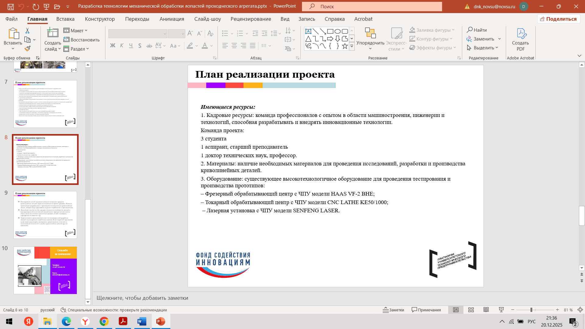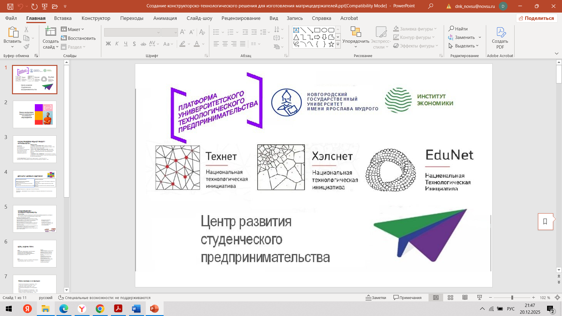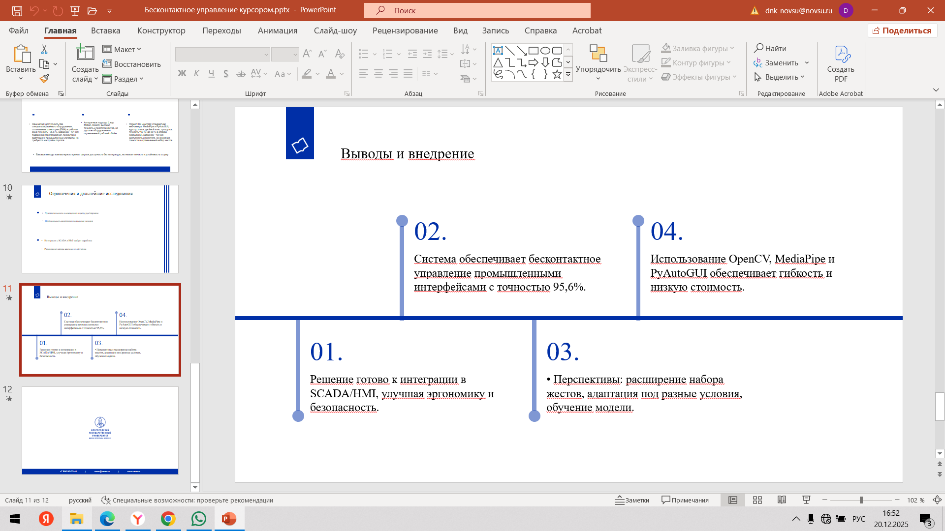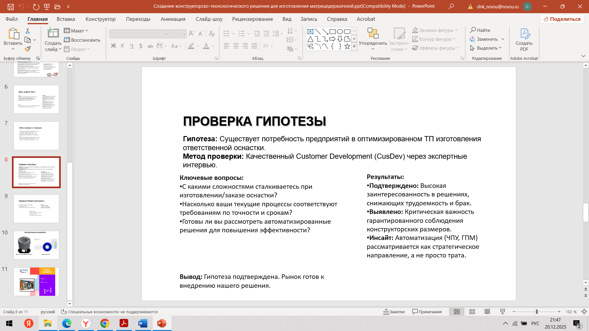 Состоялась 10-я очная встреча команды с трекером Мырцевым Александром Николаевичем и наставником Угрюмовой Марией Николаевной. С наставником Марией Николаевной команда обсудила очную консультацию с экспертом. Провели проверку и утверждение материалов для Демо - дня (презентация, прототип, раздаточные материалы). Александр Николаевич, совместно с командой стартап-проекта, провел оценку прогресса стартап-проекта за весь период акселерации и планы по постакселерационной работе с индустриальными партнерами после итогового Демо – дня.