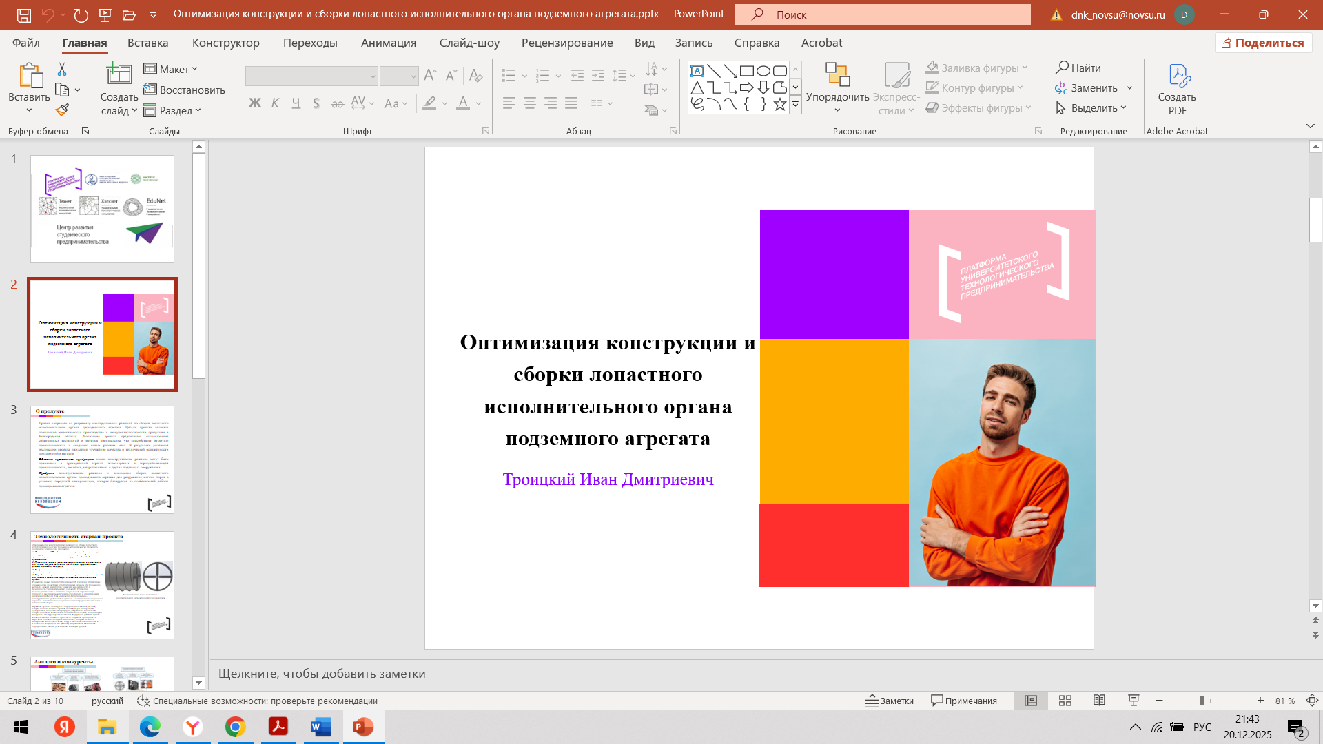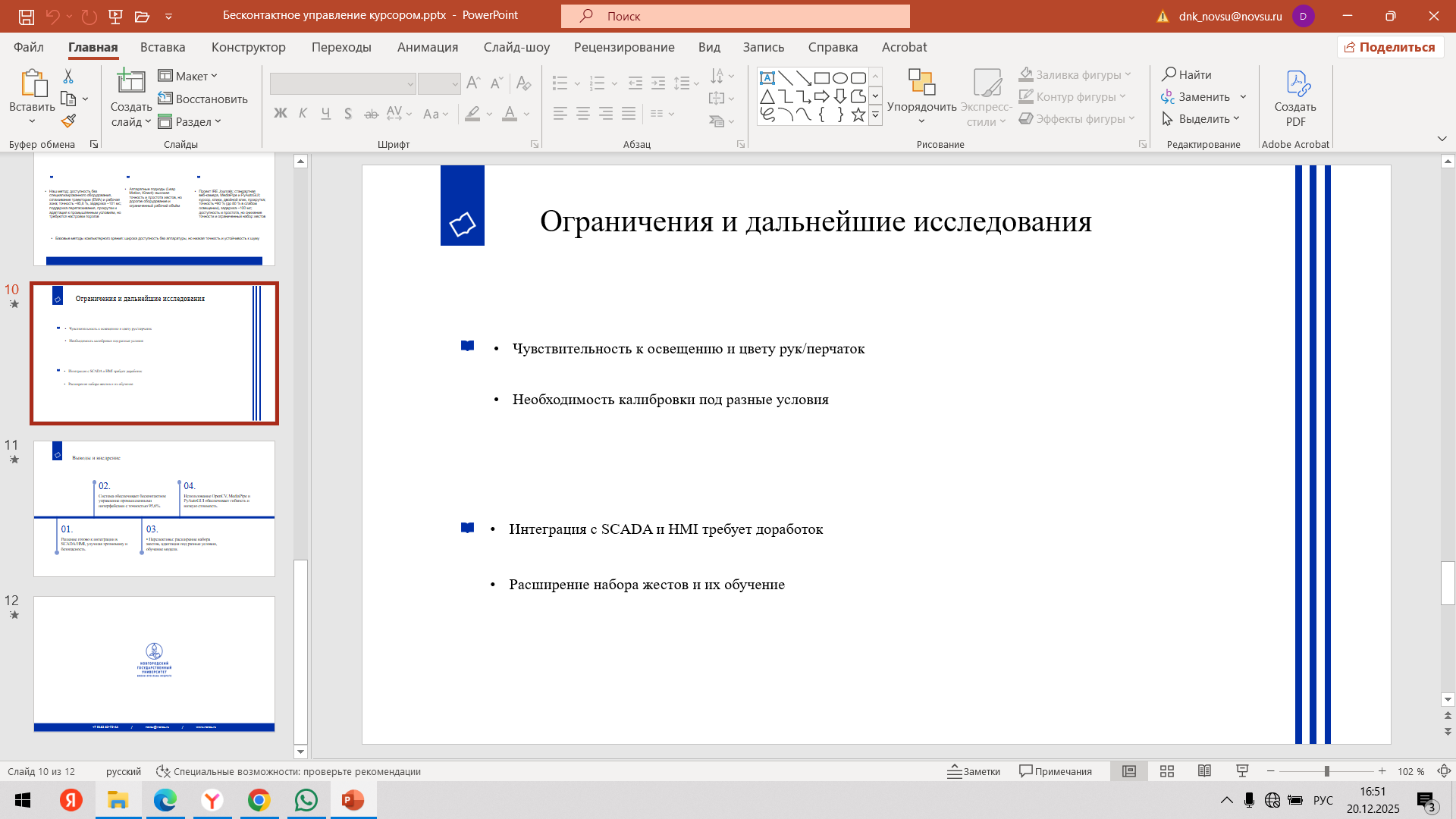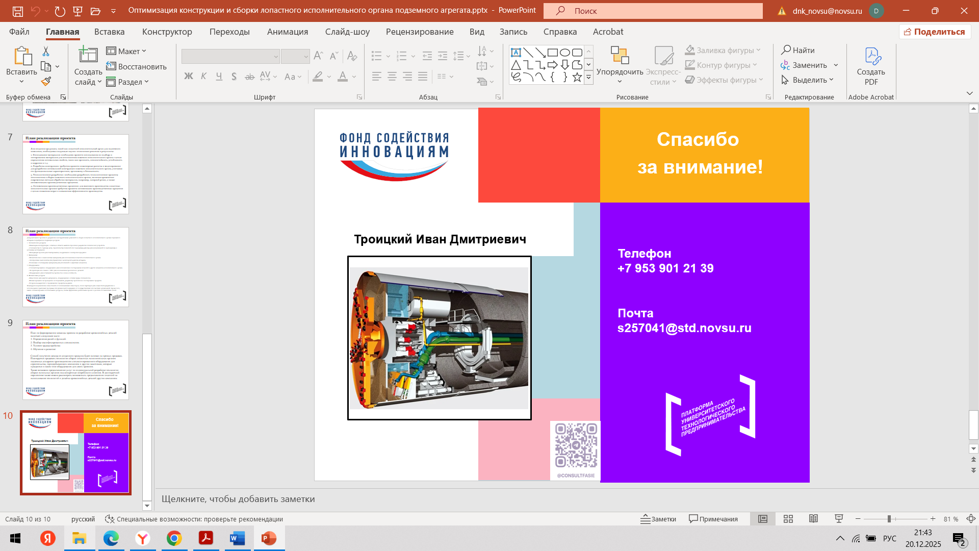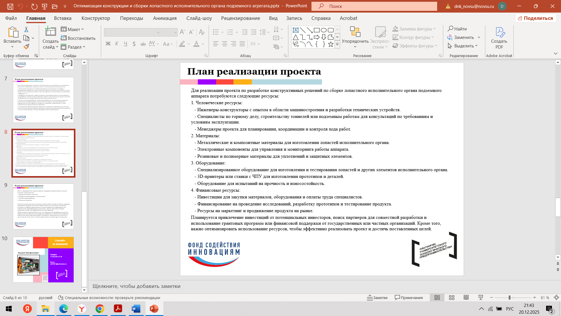 Состоялась 10-я очная встреча команды с трекером Мырцевым Александром Николаевичем и наставником Угрюмовой Марией Николаевной. С наставником Марией Николаевной команда обсудила очную консультацию с экспертом. Провели проверку и утверждение материалов для Демо - дня (презентация, прототип, раздаточные материалы). Александр Николаевич, совместно с командой стартап-проекта, провел оценку прогресса стартап-проекта за весь период акселерации и планы по постакселерационной работе с индустриальными партнерами после итогового Демо – дня.