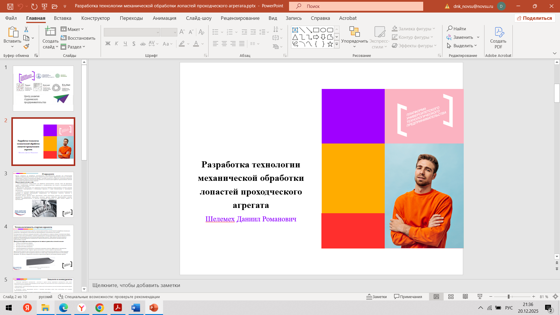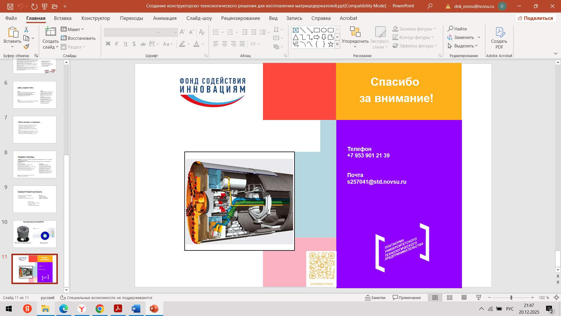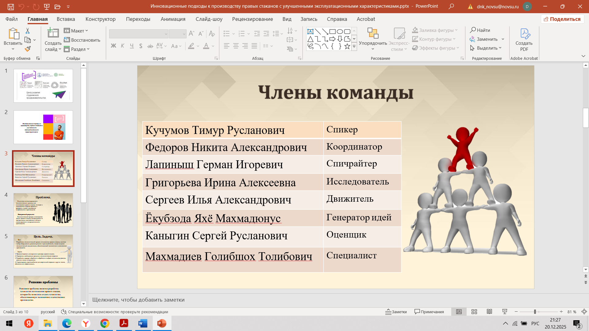 Состоялась 10-я очная встреча команды с трекером Нозирзоды Шодмоном Салохидином и наставником Угрюмовой Марией Николаевной. С наставником Марией Николаевной команда обсудила очную консультацию с экспертом. Провели проверку и утверждение материалов для Демо - дня (презентация, прототип, раздаточные материалы). Шодмон Салохидин, совместно с командой стартап-проекта, провел оценку прогресса стартап-проекта за весь период акселерации и планы по постакселерационной работе с индустриальными партнерами после итогового Демо – дня.