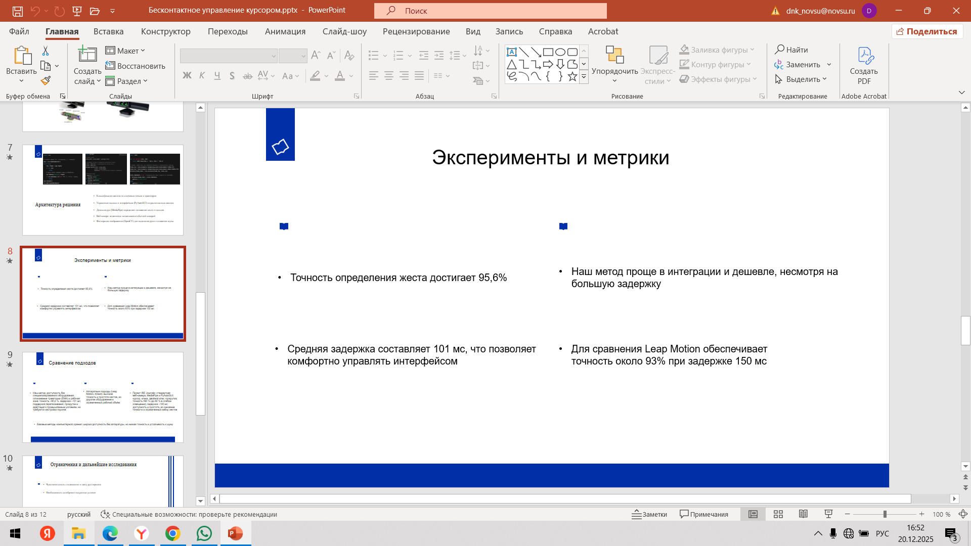 Состоялась 10-я очная встреча команды с трекером Мырцевым Александром Николаевичем и наставником Ивановой Ольгой Петровной. С наставником Ольгой Петровной команда обсудила очную консультацию с экспертом. Провели проверку и утверждение материалов для Демо - дня (презентация, прототип, раздаточные материалы). Александр Николаевич, совместно с командой стартап-проекта, провел оценку прогресса стартап-проекта за весь период акселерации и планы по постакселерационной работе с индустриальными партнерами после итогового Демо – дня.
